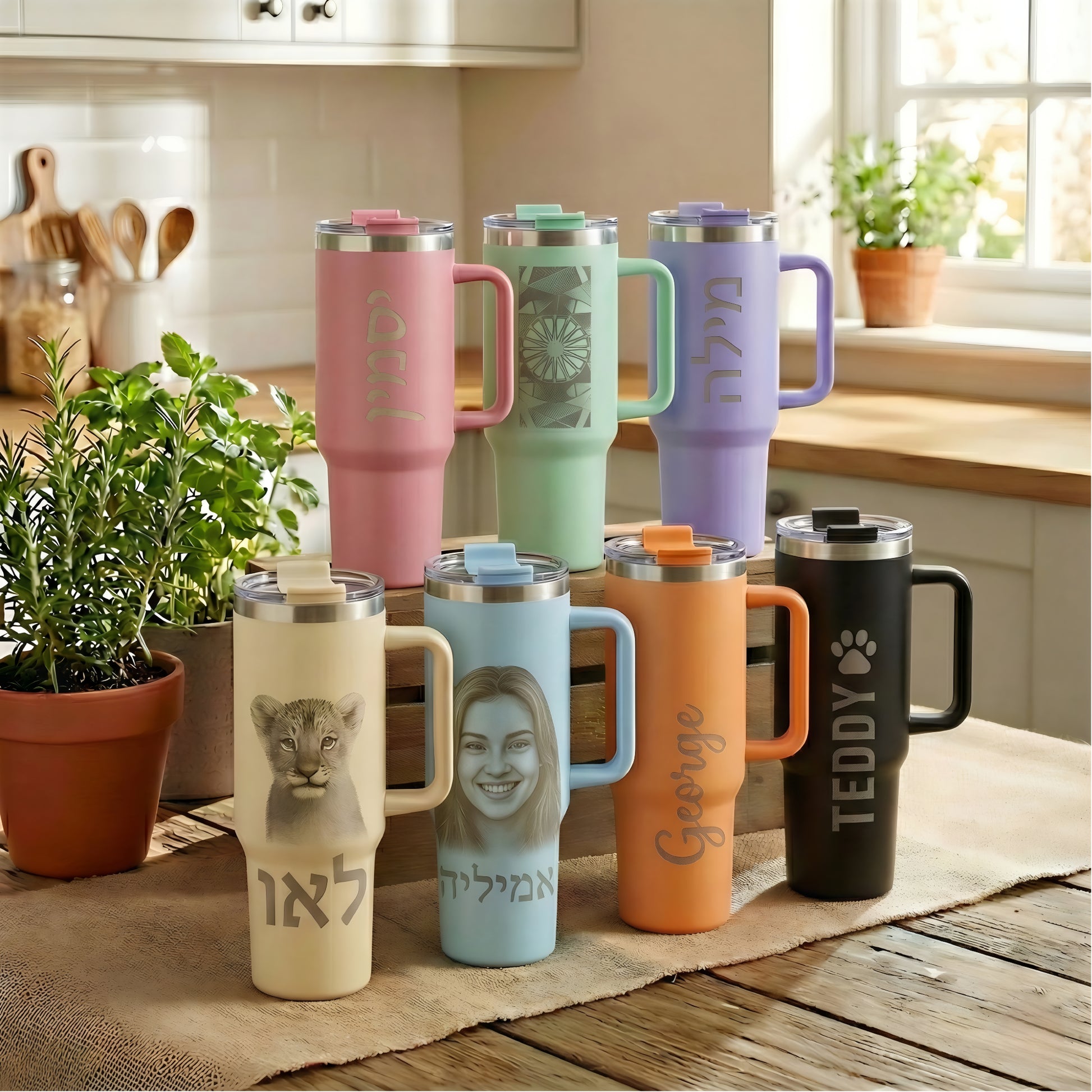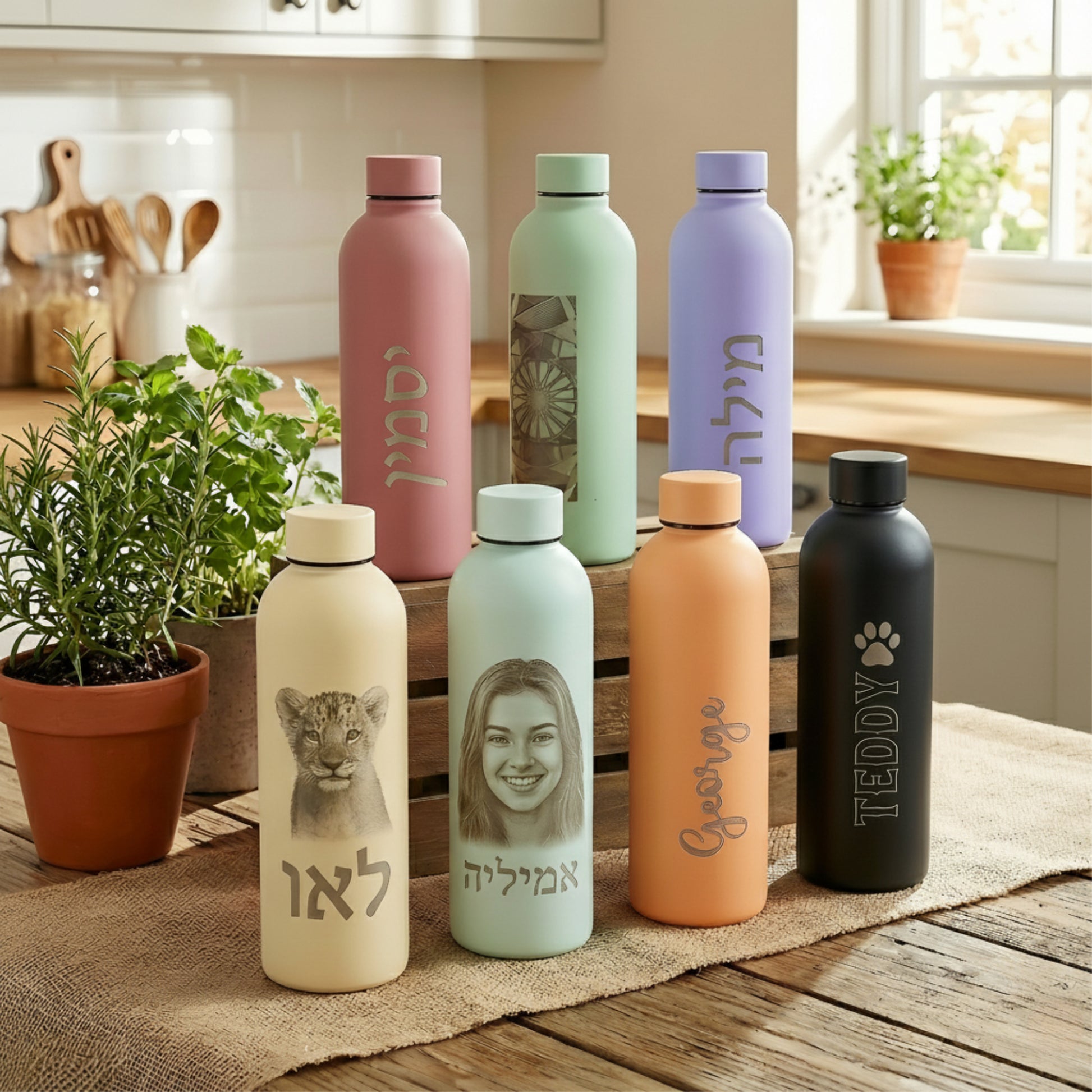 הבקבוק מגיע במגוון צבעי פסטל עכשוויים ובעיצוב מינימליסטי נקי. אנחנו ניקח את השם, הכינוי או המילה שאתם הכי אוהבים ונחרוט אותה בלייזר בדיוק מושלם, כדי ליצור עבורכם פריט שהוא לא רק שימושי, אלא גם הצהרה אישית.