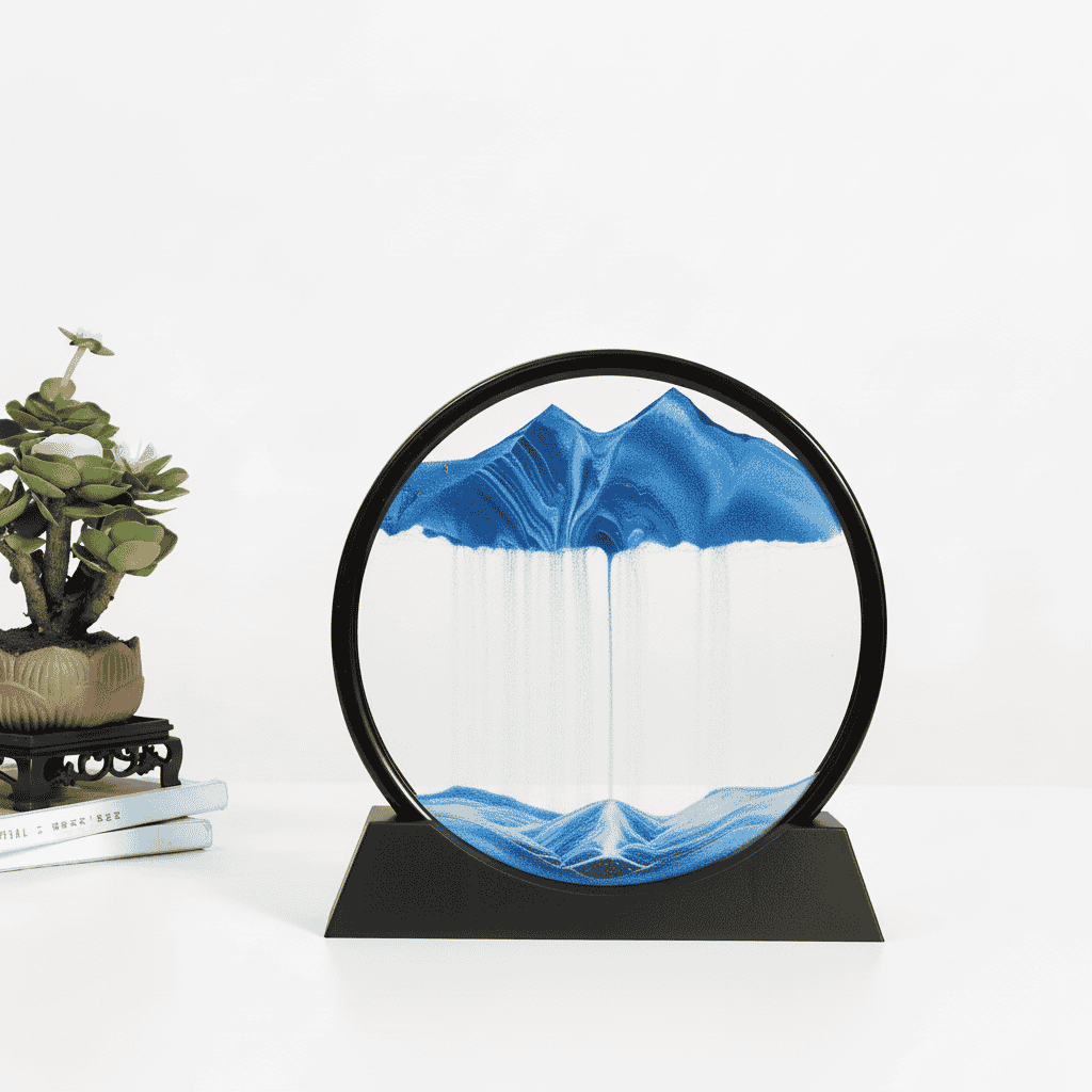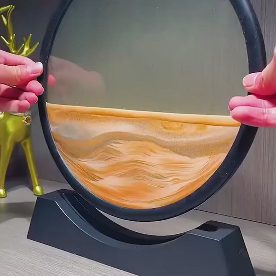 חווה תחושת שלווה ורוגע עם תצוגת אמנות החול המהפנטת הזו. כאשר אתה מסובב את המסגרת העגולה, החול העדין והצבעוני זורם בנוזל, ויוצר נופים ייחודיים ומשתנים של הרים, דיונות ועמקים. יצירה אלגנטית ומרגיעה זו מושלמת לשולחן, למדף ספרים או לכל חלל שבו תרצה להוסיף מגע של אמנות ושלווה.
