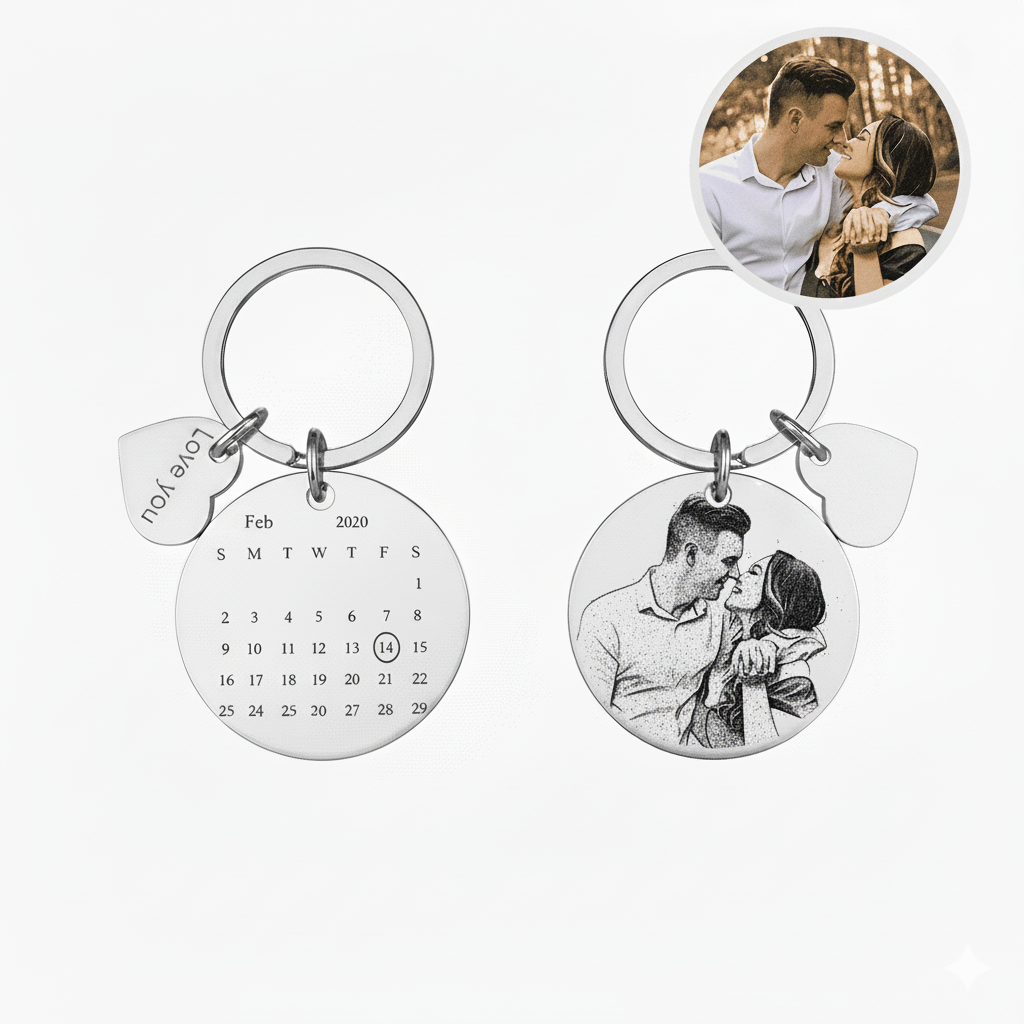 מחזיק מפתחות עם תמונה חרוטה מצד אחד ומצד שני לוח שנה עם התאריך המיוחד שלכם, לכל שאלה אנחנו כאן.