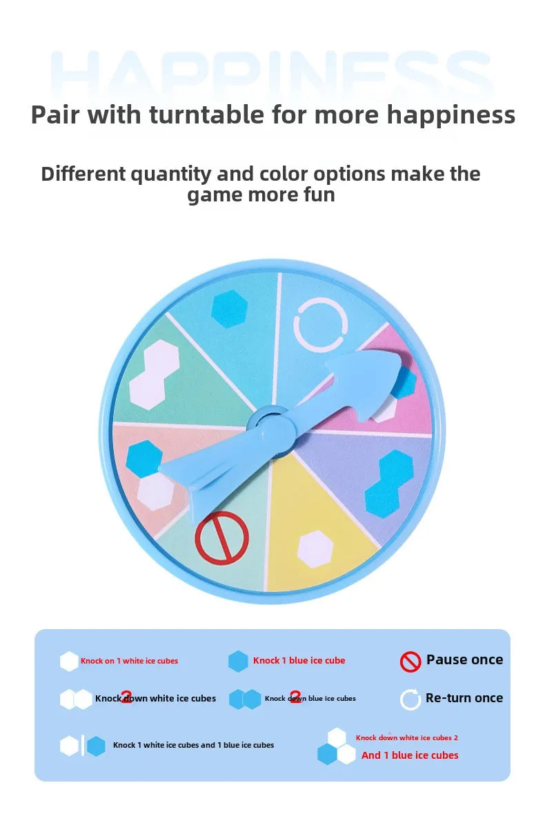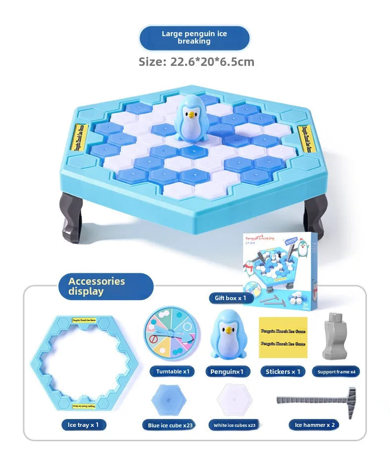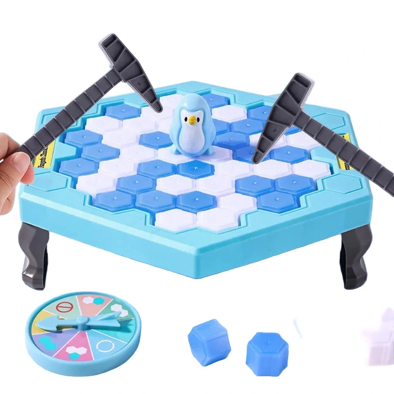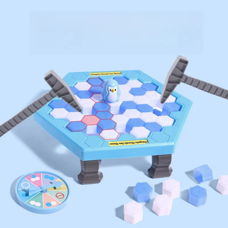 השחקנים מתחלפים בפטישים קטנים כדי להקיש בעדינות על גושי הקרח הכחולים מתחת לפינגווין.