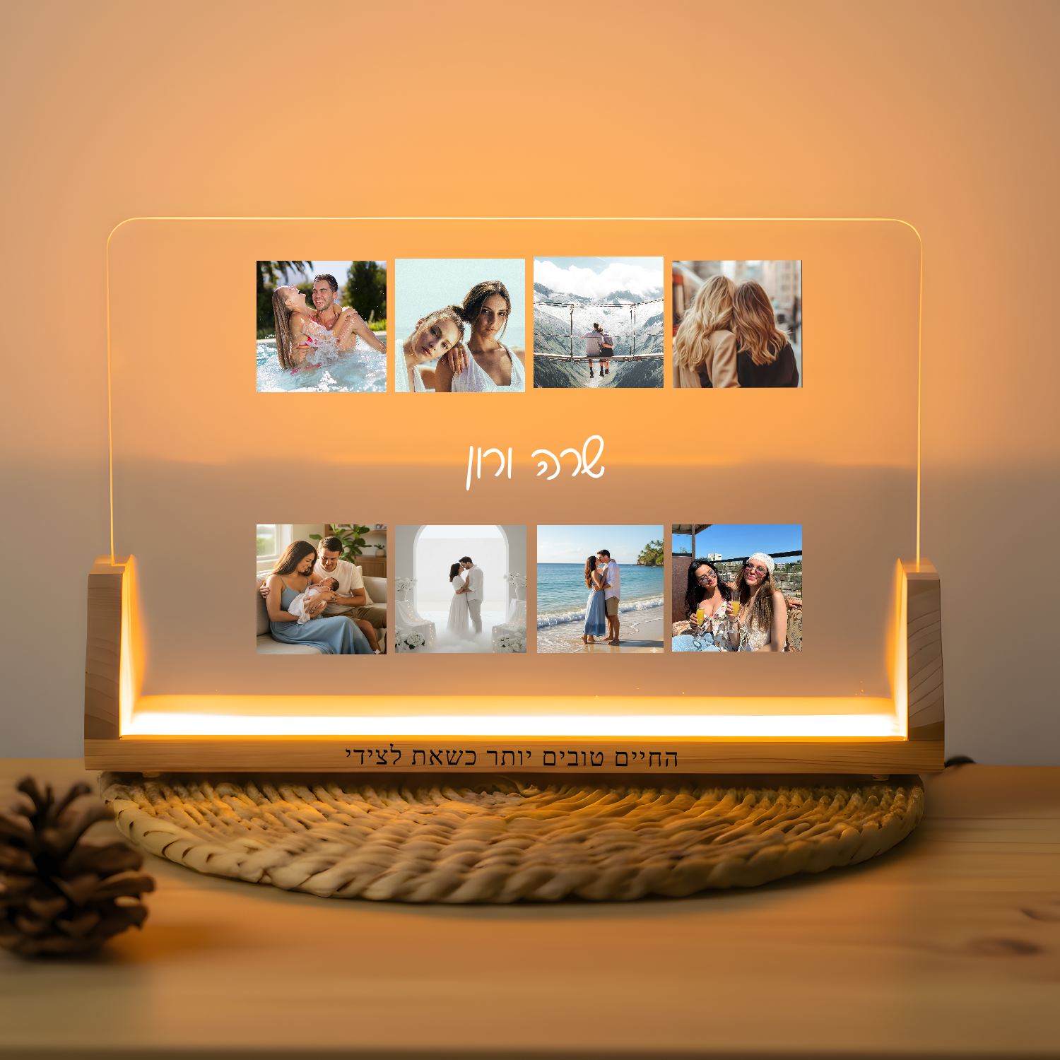 מנורת לילה מעוצבת ומרגשת בגודל 20×15 ס״מ, מודפסת על זכוכית אקריליק שקופה באיכות פרימיום עם תאורת LED חמה ונעימה ובסיס עץ טבעי יוקרתי. העיצוב הייחודי כולל 8 תמונות שלכם מסודרות בקולאז׳ מרהיב + אפשרות להוסיף שמות, תאריך או ברכה קצרה במרכז ולמטה.