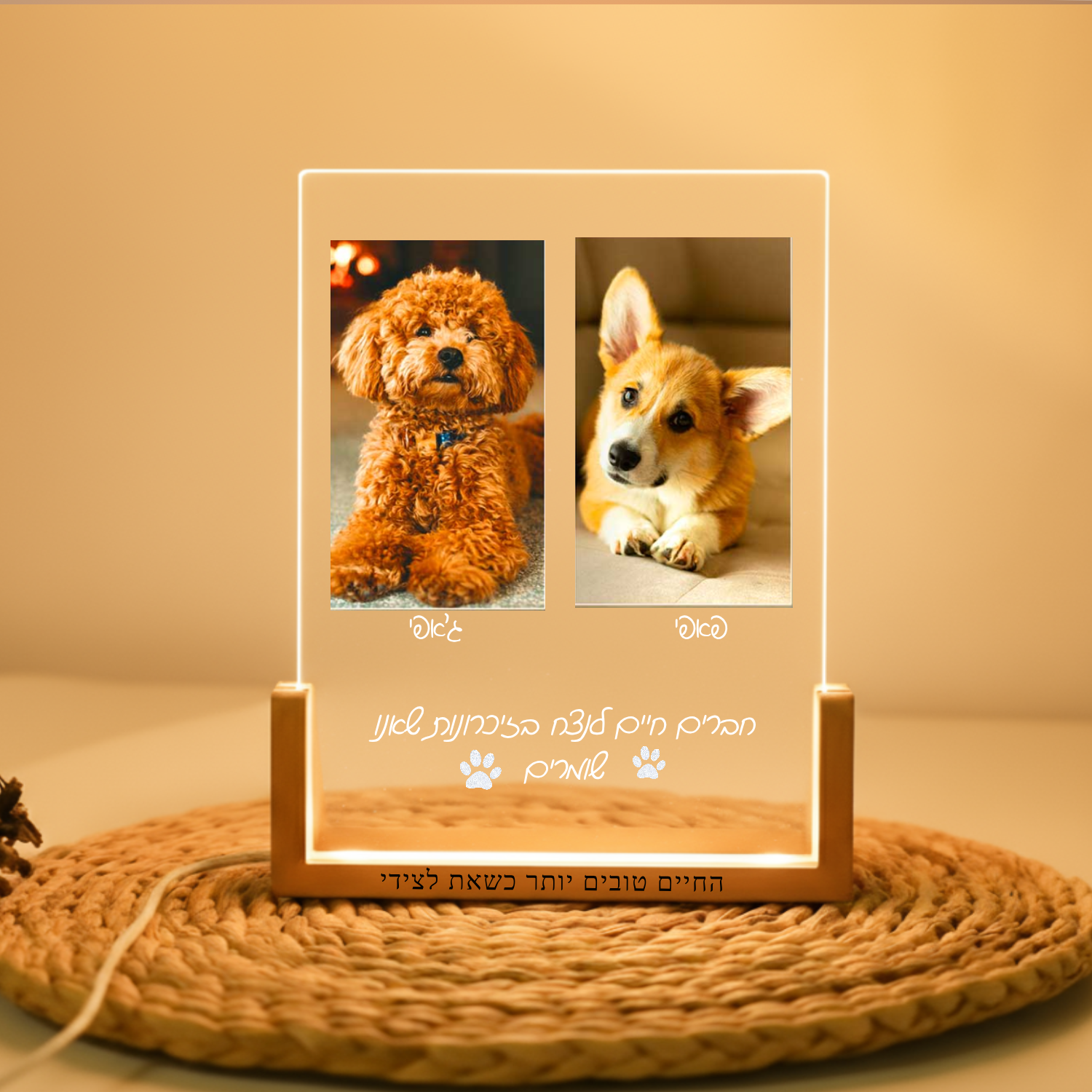 מנורת לילה חמודה ומרגשת בגודל 15×15 ס״מ, מודפסת על זכוכית אקריליק שקופה באיכות פרימיום עם תאורת LED חמה ונעימה ובסיס עץ טבעי יוקרתי. העיצוב כולל שתי תמונות שלכם (אחת ליד השנייה) + אפשרות להוסיף: