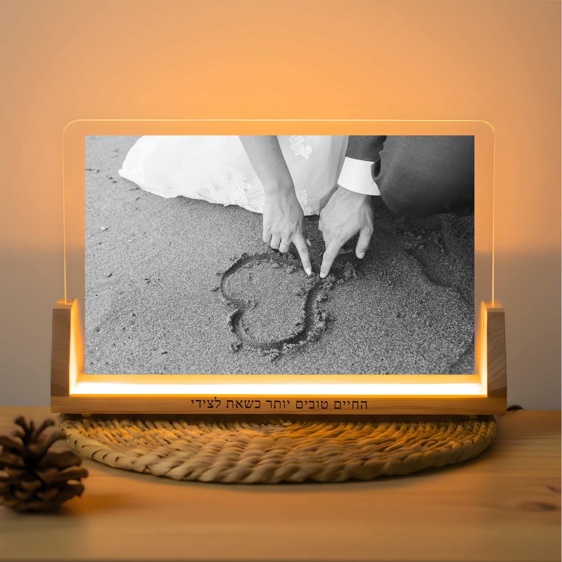 מנורת לילה קלאסית, נקייה ומרגשת בגודל 15×20 ס״מ, מודפסת על זכוכית אקריליק שקופה באיכות פרימיום עם תאורת LED חמה ונעימה ובסיס עץ טבעי יוקרתי. העיצוב כולל תמונה אחת גדולה שלכם;מתחתיה – ברכה, שמות, תאריך או כל טקסט שתרצו.