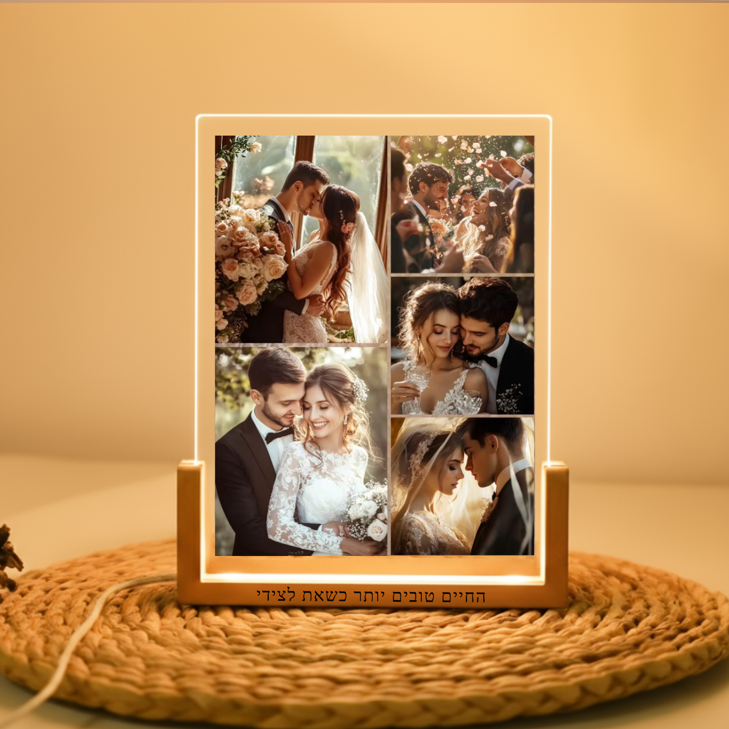 מנורת לילה מעוצבת ומרגשת בגודל 15×15 ס״מ, מודפסת על זכוכית אקריליק שקופה באיכות פרימיום עם תאורת LED חמה ונעימה ובסיס עץ טבעי יוקרתי. העיצוב כולל קולאז׳ מרהיב של 5 תמונות שלכם – הזיכרונות הכי יפים שלכם באור מושלם.