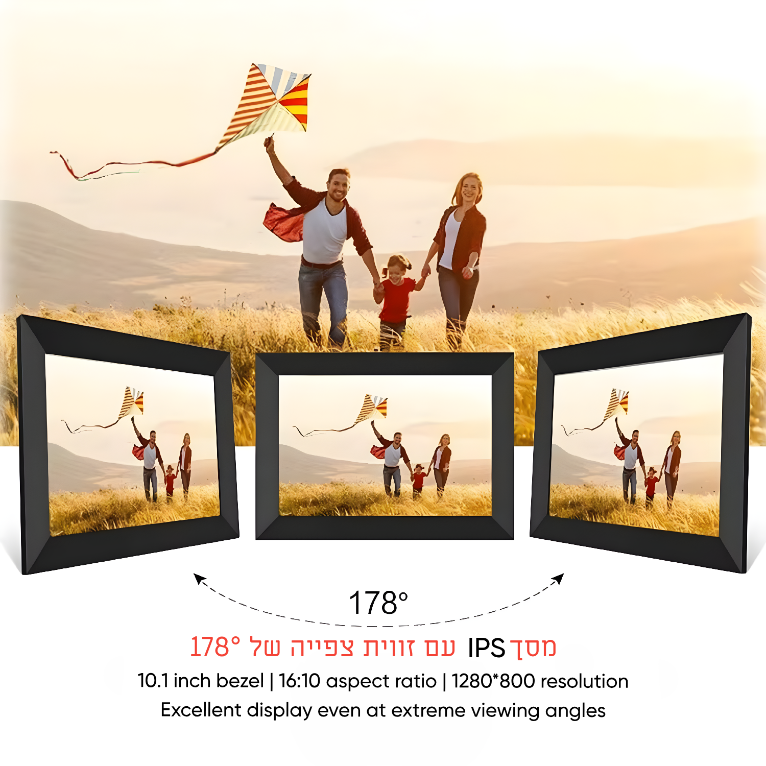מסך המגע האיכותי בגודל "10.1, בטכנולוגיית IPS וברזולוציית 1280x800, מציג תמונות וסרטונים בצורה מדהימה, חדה ועם צבעים חיים. תוכלו לדפדף בין תמונות, למחוק סרטונים או לעצור את מצגת השקופיות – הכל בלחיצת אצבע מהירה. ניתן לכוונן את הבהירות ואת מצב השינה בהגדרות לפי רצונכם.