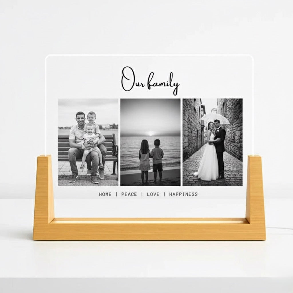מתנה מעוצבת לבית מנורה משפחתית עם תמונה – מנורה עם 3 תמונות ומשפט