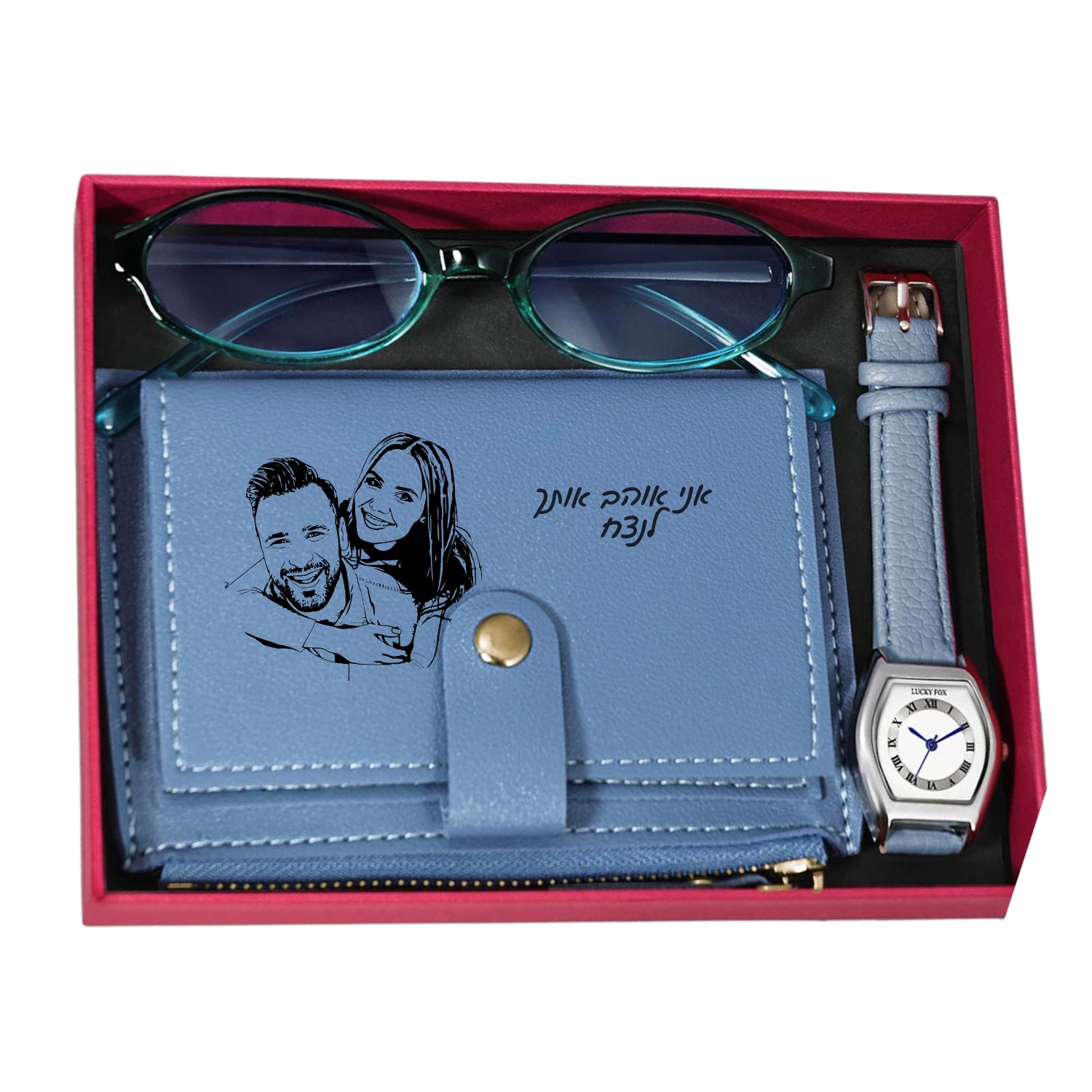 חגגו אירוע מיוחד עם סט מתנה יוקרתי זה הכולל שלושה פריטים, מושלם עבור האדם האהוב בחייכם. קופסה אלגנטית זו כוללת ארנק, שעון יד ומשקפי שמש, שכולם ניתנים לחריטה בלייזר עם תמונה והודעה אישית. זוהי יותר מסתם מתנה – זהו אוסף של מזכרות המנציחות זיכרון יקר.