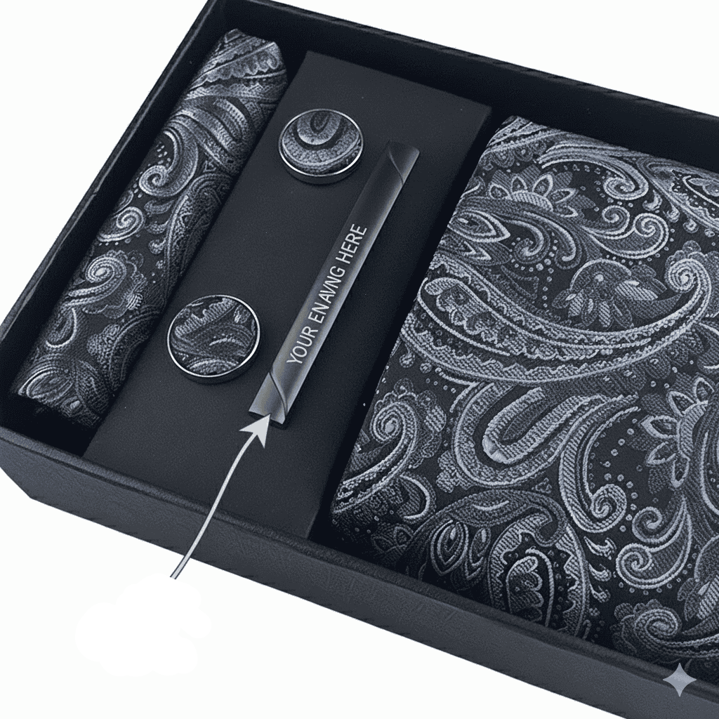 סט מתנה אלגנטי ונצחי זה מושלם עבור הגבר המעריך נגיעה של תחכום. הוא כולל עניבה מעוצבת להפליא עם דפוס פייזלי קלאסי, זוג חפתים תואם וסיכת עניבה אלגנטית. סיכת העניבה בצבע כסף היא המקום המושלם לחריטת לייזר אישית, המאפשרת לך להוסיף שם, ראשי תיבות או תאריך מיוחד כדי להפוך זאת למתנה אישית ובלתי נשכחת באמת.