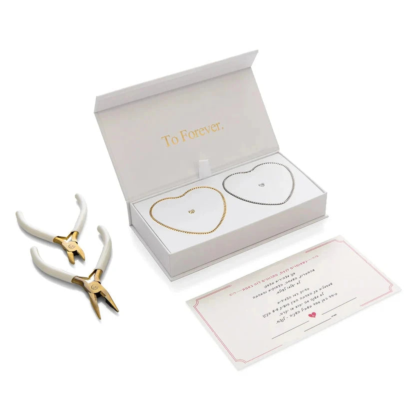 חגגו את הקשר הנצחי שלכם עם ערכת "צמיד לנצח" ייחודית זו. הערכה, המיועדת באופן בלעדי לזוגות, כוללת שני צמידי שרשרת אלגנטיים וכלי מיוחד לאבטח אותם לצמיתות. אבזמי הלב המינימליסטיים מסמלים קשר שנועד להחזיק מעמד. זה יותר מסתם תכשיט; זוהי חוויה של יצירת זיכרון מתמשך יחד. מושלם לימי נישואין, ימי הולדת, או כמתנה ספונטנית המראה על המחויבות שלכם. זמין בצבעי זהב, כסף ורוז גולד.
