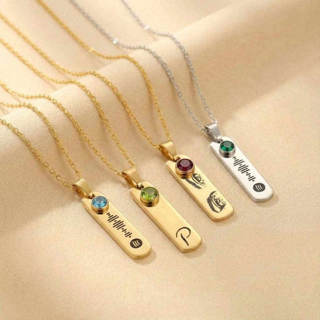 תכשיט אלגנטי ומרגש: תליון מלבני דקיק עם חריטה כפולה – צד אחד טקסט אישי (שם, תאריך, משפט רומנטי), צד שני תמונת עיניים של יקירך.