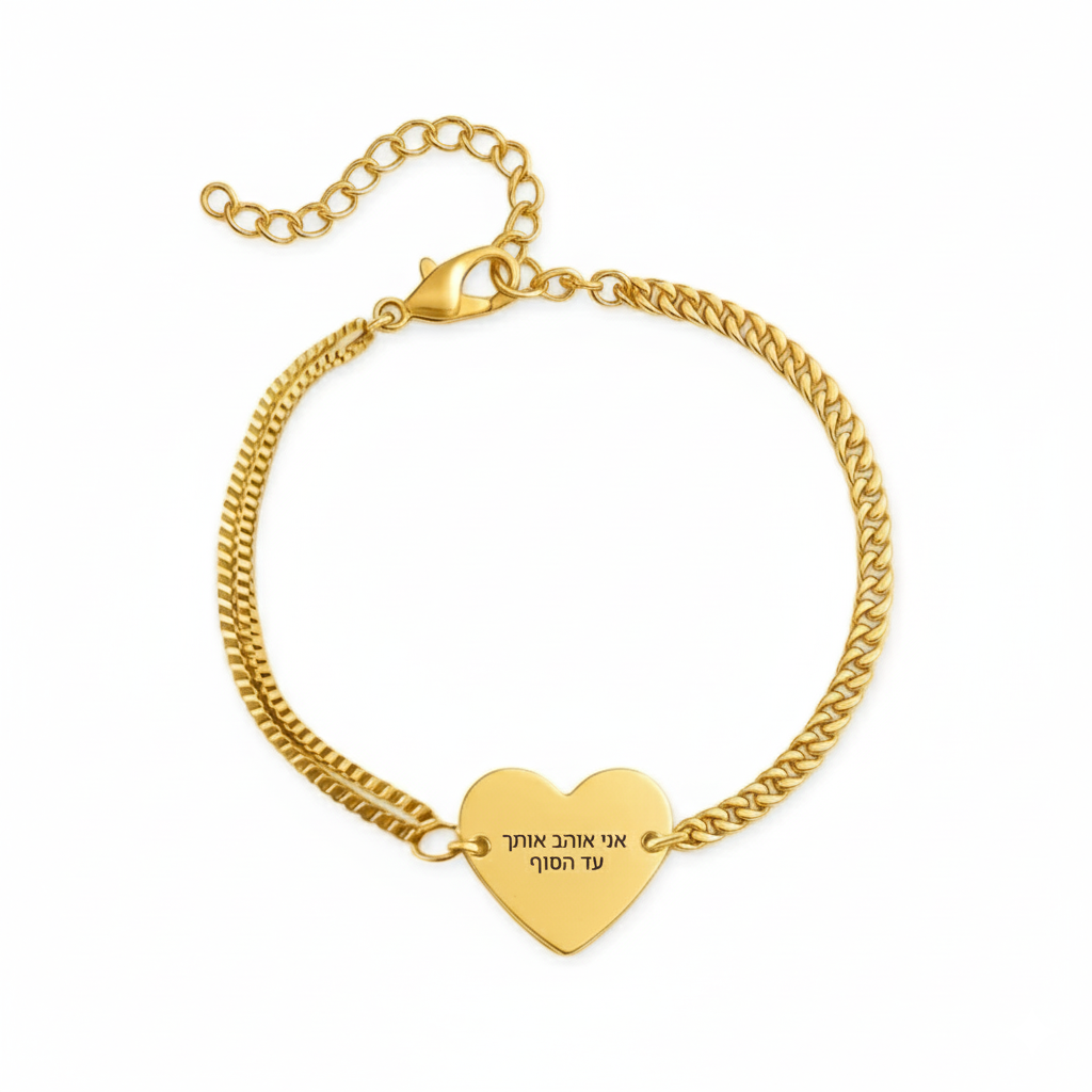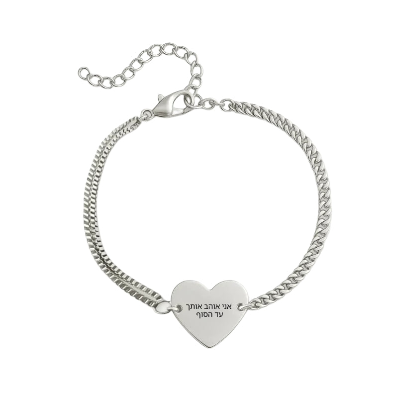 צמיד שרשרת כפולה ולב , תכשיט יוקרתי עם חריטה אישית של הקדשה/משפת