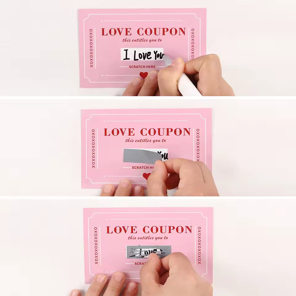 הפכו את המתנה שלכם למשחקית ואישית עם סט קופוני האהבה הניתנים להתאמה אישית. כל כרטיס יכול להתמלא עם "קופון" ייחודי לאהוב/ה שלכם, מארוחה מבושלת בבית ועד לערב סרט. מדבקות הגירוד המצורפות מכסות את ההודעה שלכם, והופכות כל קופון להפתעה מהנה. זוהי מתנה מושלמת ליום נישואין, יום האהבה, או סתם כדי להראות קצת יותר אהבה.