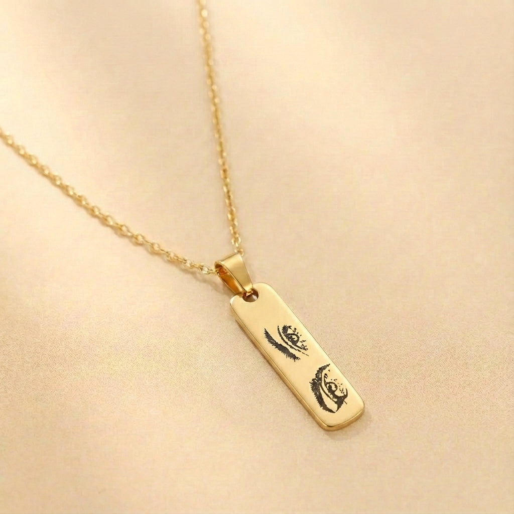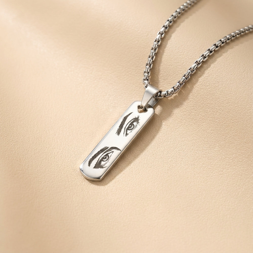 תכשיט אלגנטי ומרגש: תליון מלבני דקיק עם חריטה כפולה – צד אחד טקסט אישי (שם, תאריך, משפט רומנטי), צד שני תמונת עיניים של יקירך.