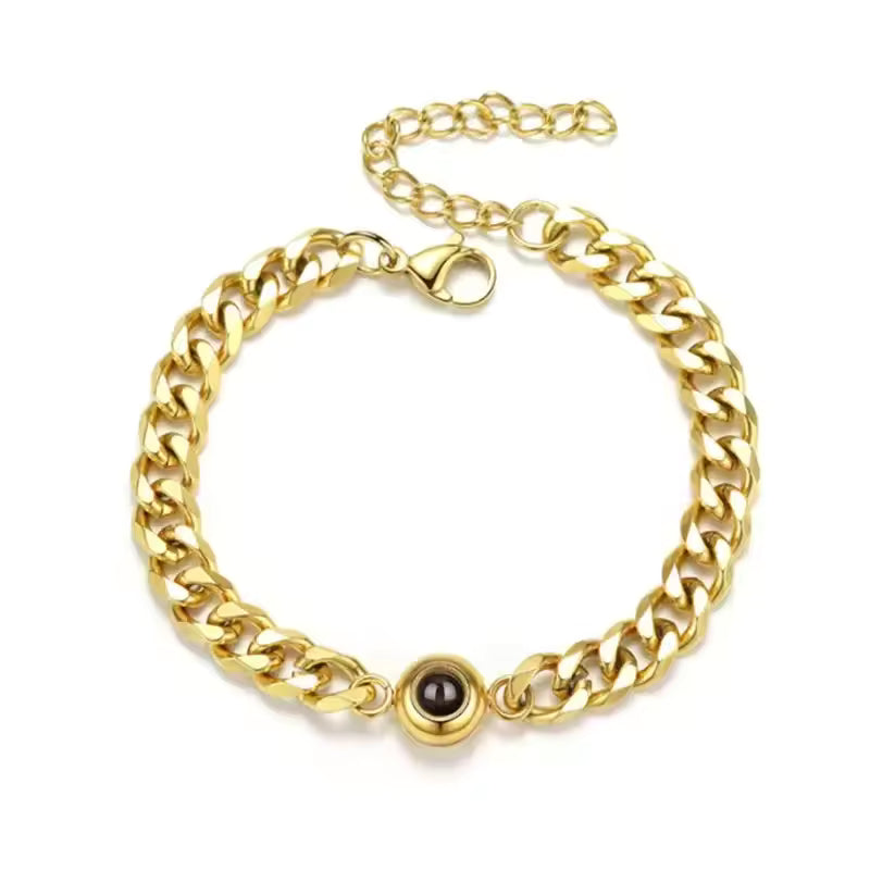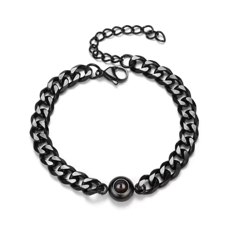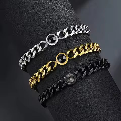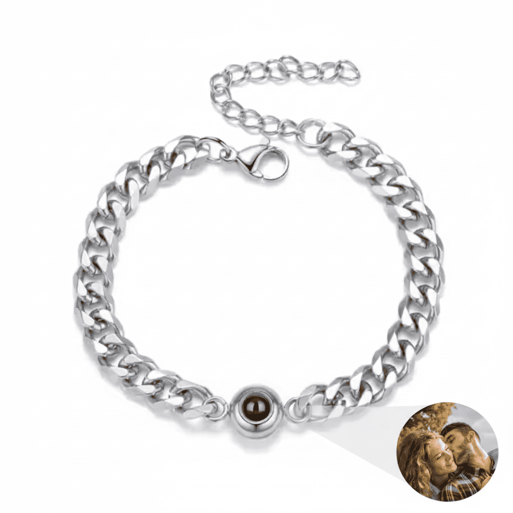 שמור את הזיכרון היקר ביותר שלך קרוב עם צמיד הקרנה אלגנטי זה. במרכזו של צמיד מסוגנן זה נמצא חרוז קטן ואיכותי שמסתיר סוד: הוא מקרין תמונה אישית כאשר מקור אור מושחל דרכו. חרוט בלייזר עם התמונה האהובה עליך למתנה ייחודית ומשמעותית, המושלמת לכל אירוע, מימי נישואין ועד ימי הולדת.